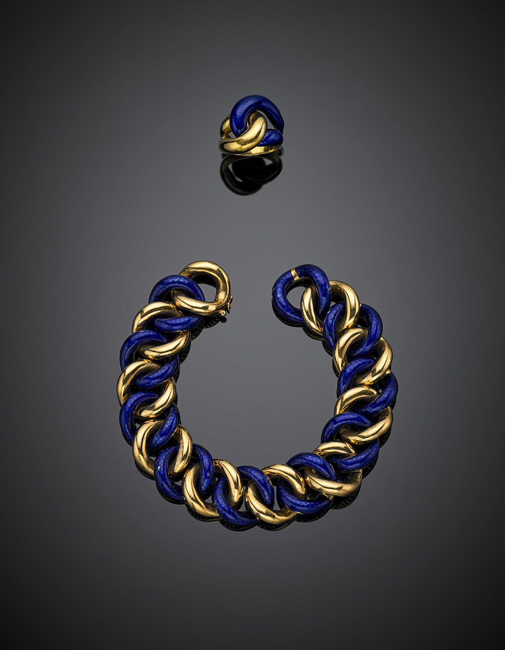 Demi-parure composta da bracciale e anello in oro giallo con smalti blu....
