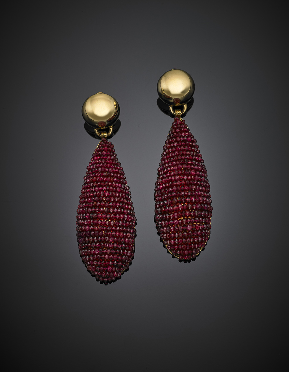 *Orecchini pendenti in oro giallo rifiniti con boules sfaccettate di spinelli rossi, g 50,59, lungh. cm 9,7, largh. cm 2,8 circa. Marcato 855 FI, donna.