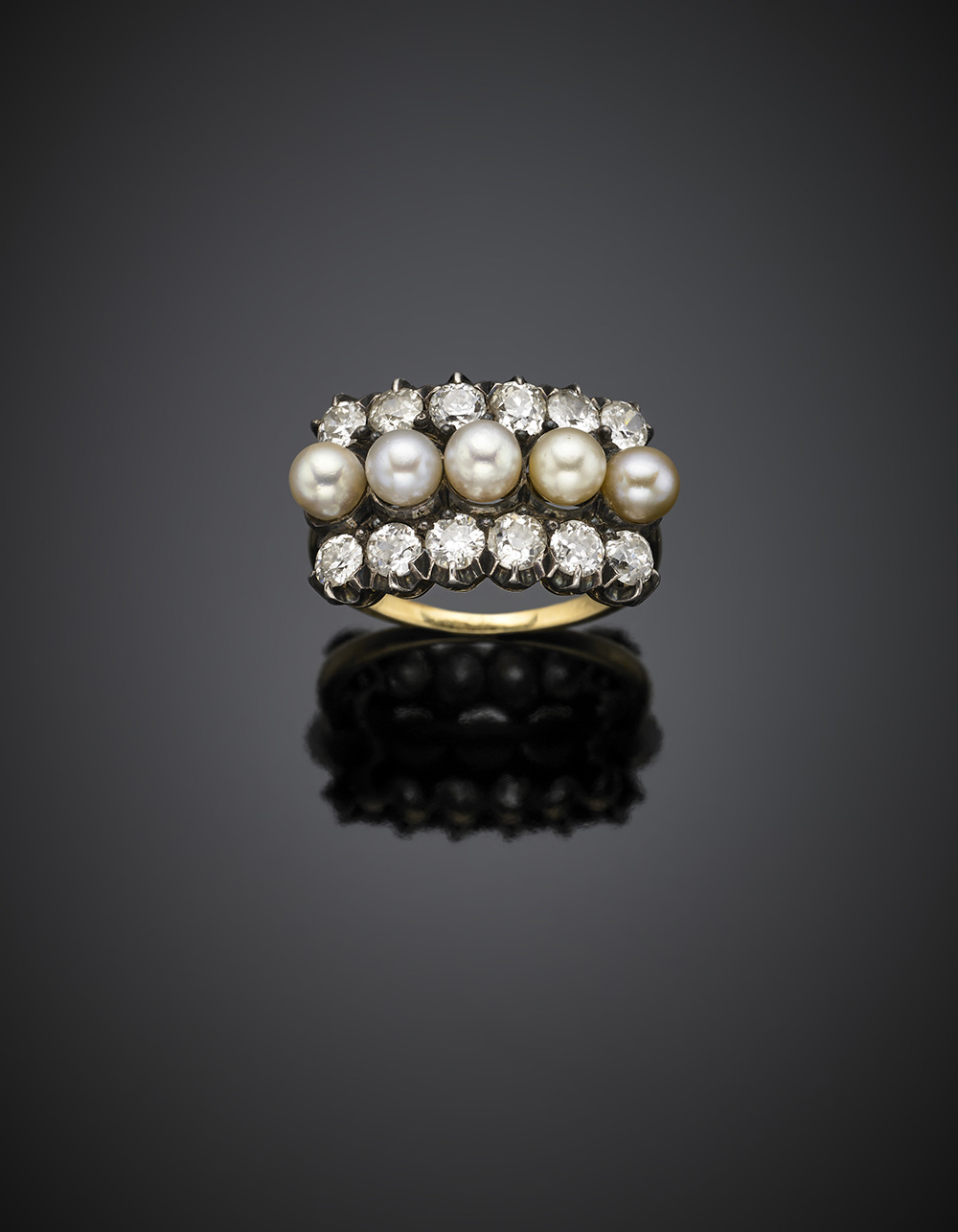 Old mine diamond and five mm4.5/5 pearl, silver and gold ring, in all ct. 2 circa g 6.20 size 15/55. In a F.lli Cali Messina box (slight defects)
