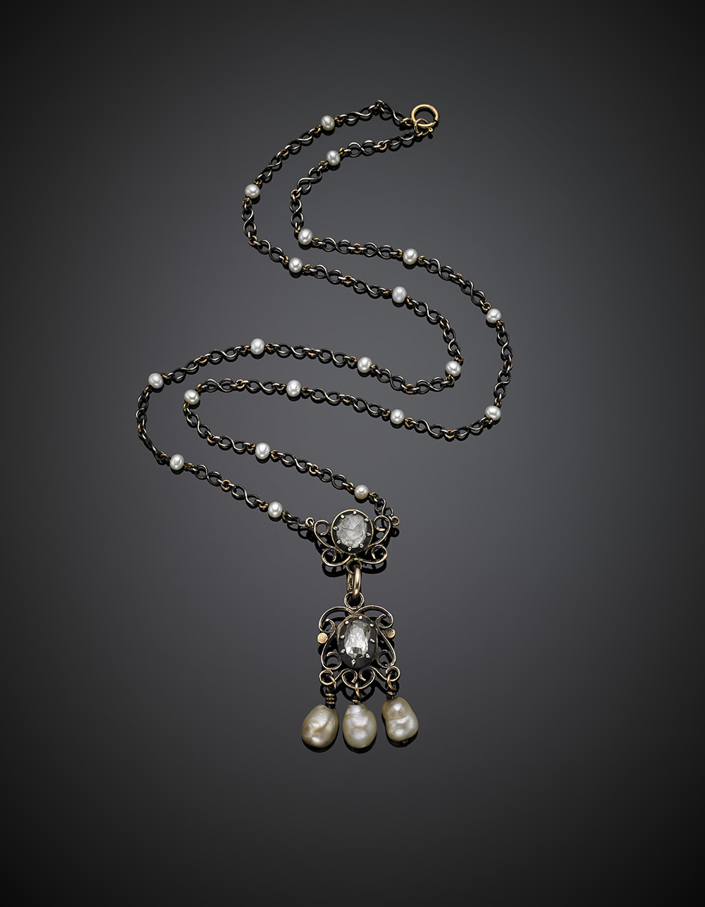Silver, 14K gold and seedpearl chain necklace with rose cut ct. 0.95 circa and ct. 0.90 circa diamond central holding three pearl drops, g 10.8, length cm 50 circa.