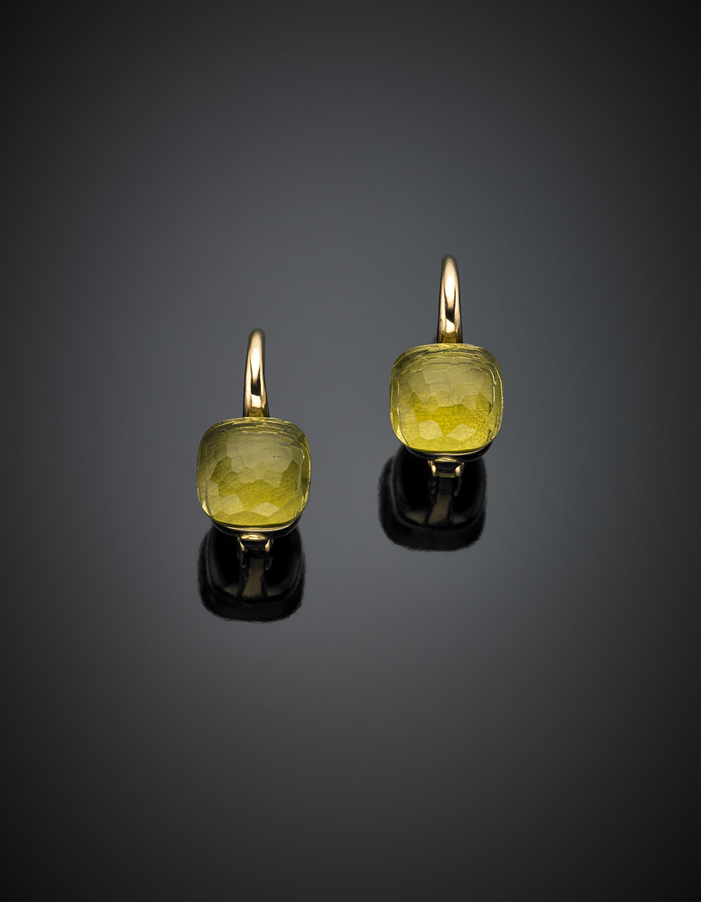 Orecchini pendenti in oro giallo con peridoti a cuscino, g 10,15, lungh. cm 2 circa. Firmato Pomellato, 469 MI.