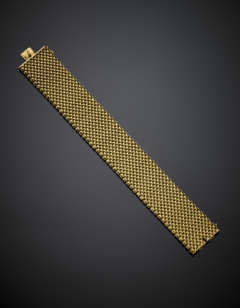 Bracciale in oro giallo a fascia intrecciata, g 84,62, lungh. cm 20,50 circa.