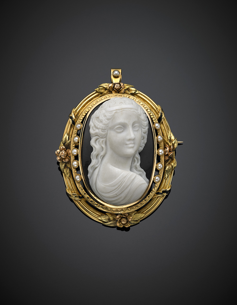 Spilla/pendente in oro giallo, verde e rosa, al centro un cammeo neoclassico in agata, rifinita con microperle, dettagli in smalto nero, g 49,91, lungh. cm 6,5, largh. cm 5 circa. Marchi francesi, orefice parziale. (lievi difetti)