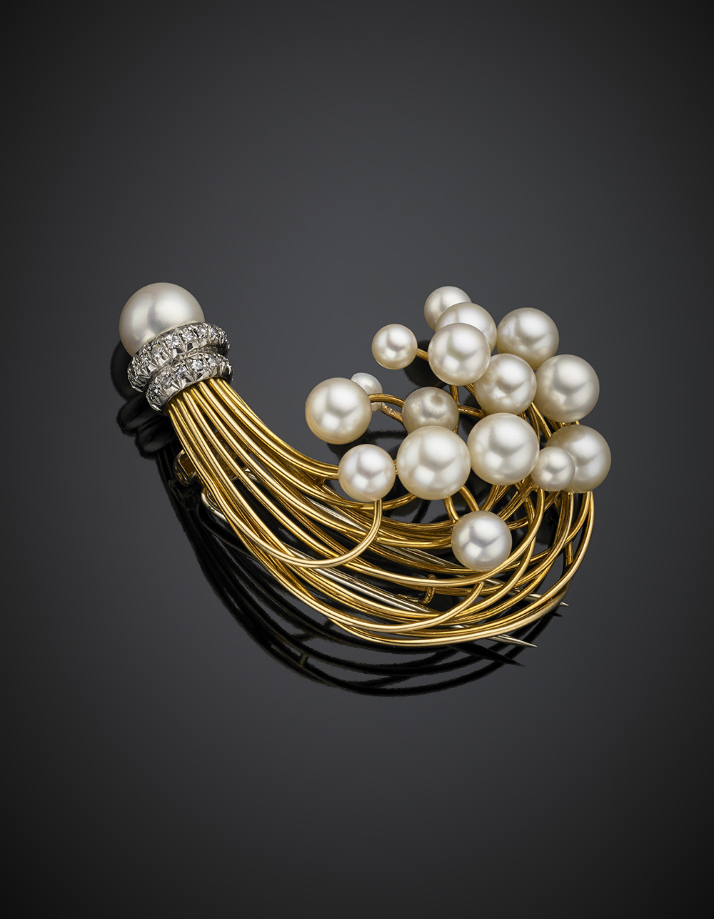FAR-TRARBroche in oro giallo a guisa di pennacchio con perle e diamanti,...