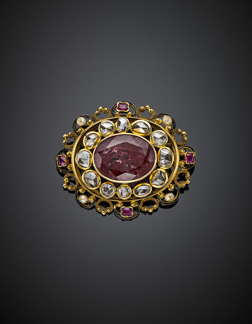 Oval ct. 21.90 circa pink tourmaline and irregular rose cut diamond yellow gold oval brooch accented with small rubies and pearls, diamonds in all ct. 3.50 circa, g 25.35.