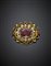 Broche in oro giallo con tormalina rosa ovale di di ct. 21,90 circa, diamanti irregolari a mezza rosetta con rubini e piccole perle a rifinirla, diamanti per complessivi ct. 3,50 circa g 25,35.