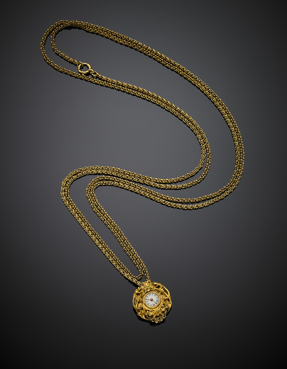 Lunga catena doppia in oro giallo a tenere un orologio barocco, g 72,91, lungh. cm 40 circa. Marchi francesi, SG e una chiave.