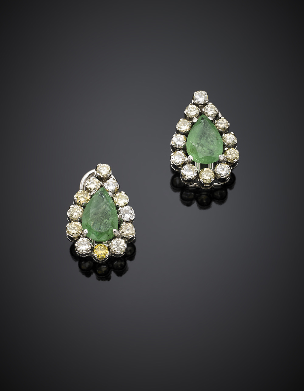 Orecchini a goccia con clip in oro bianco, diamanti rotondi per complessivi ct. 2 circa e smeraldi a goccia per complessivi ct. 3 circa, g 7,93, lungh. cm 2, largh. cm 1,20 circa.