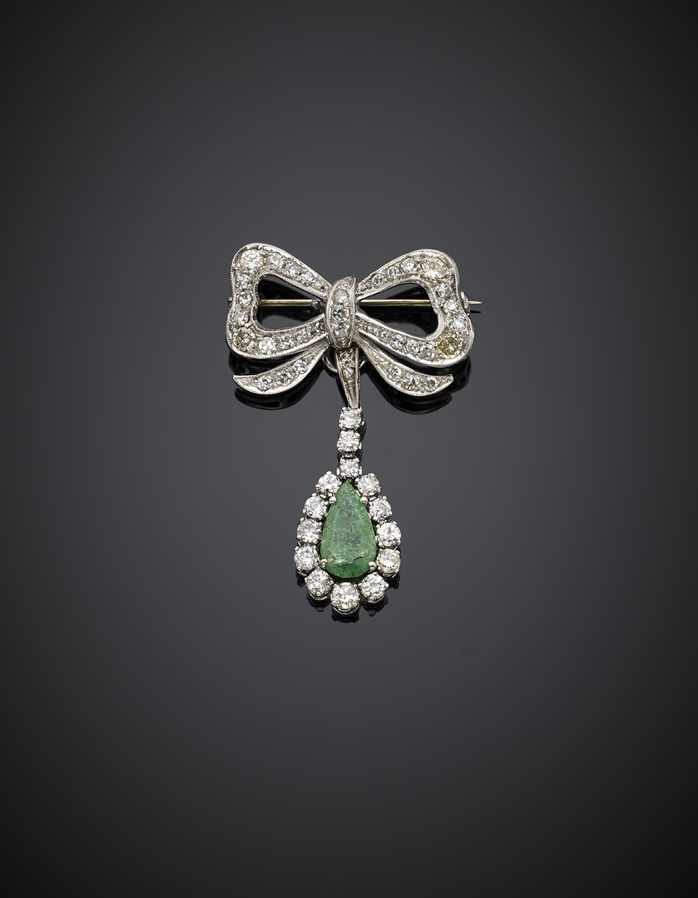 Spilla a fiocco in oro bianco e diamanti, il pendente removibile rifinito con uno smeraldo a goccia di ct. 1,60 circa, diamanti per complessivi ct. 1,20 circa g 7,81, lungh. cm 4, largh. cm 3 circa.