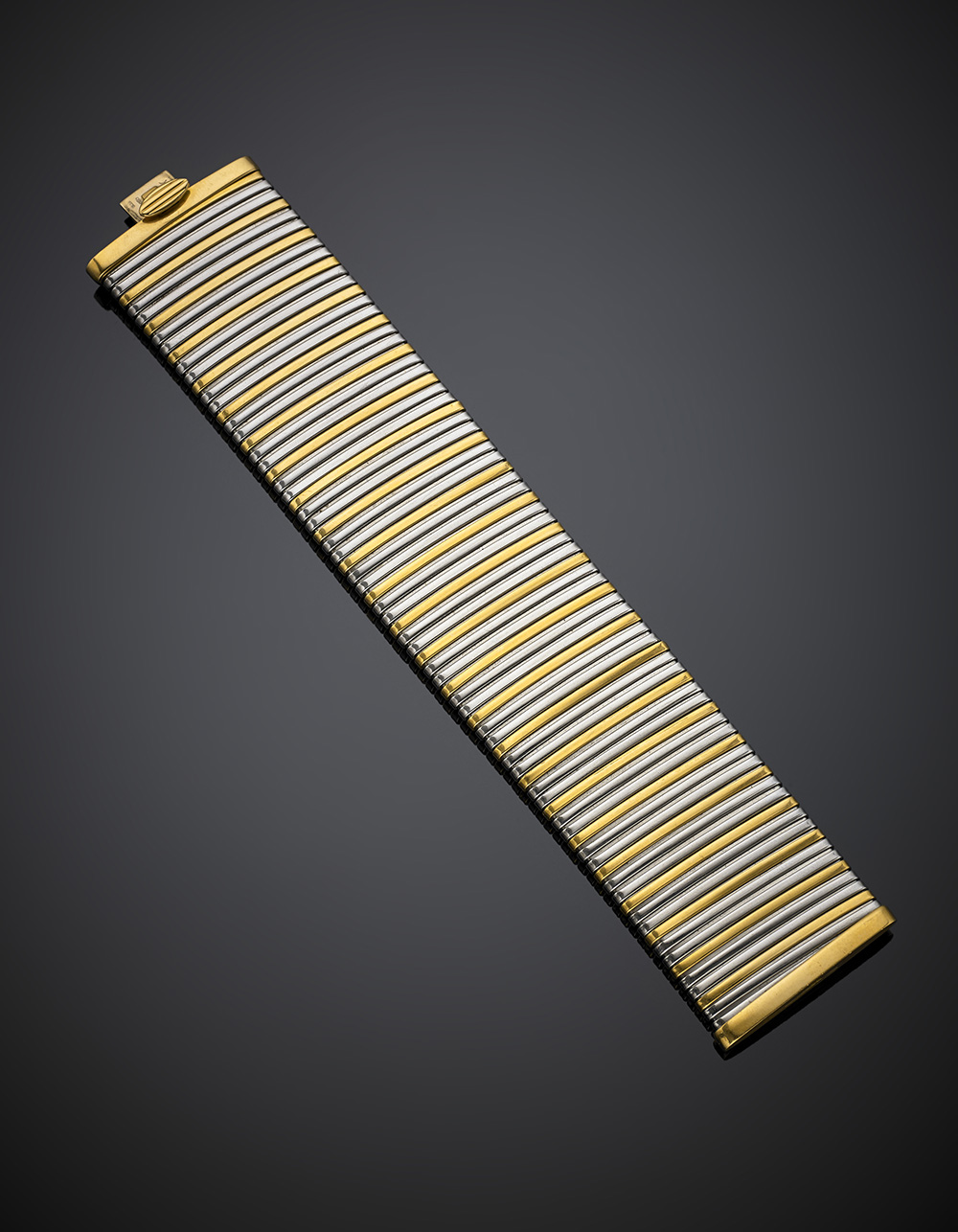 Bracciale a fascia a tubogas in oro bianco e giallo, g 72,33, lungh. cm 19,20, h cm 3,60 circa. Marcato M in quadrato, 1 To.