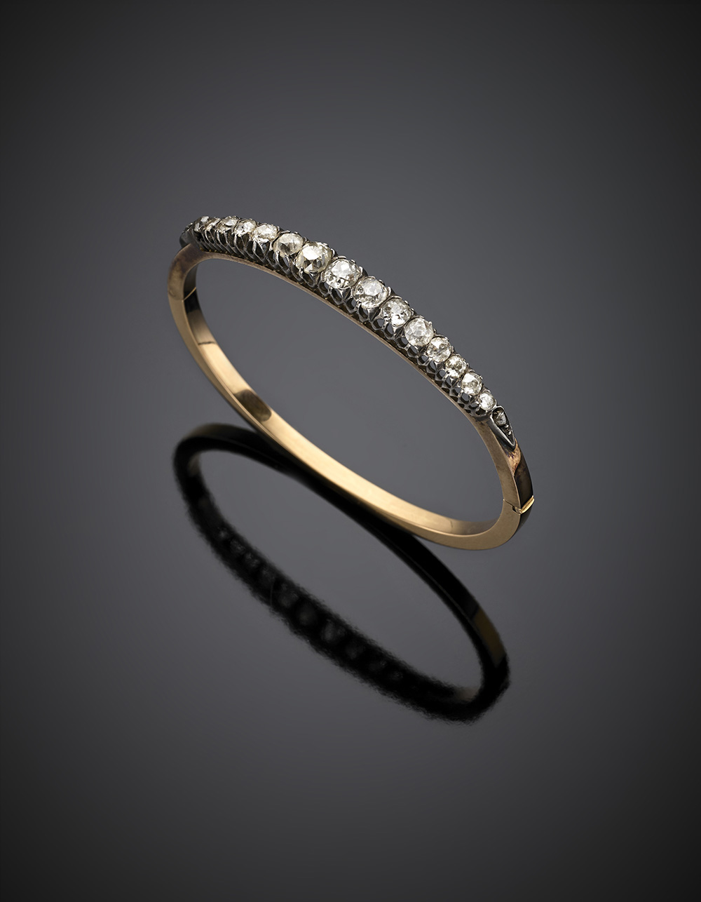 Bracciale rigido apribile, in oro giallo, argento e diamanti a cuscino per complessivi ct. 6 circa, g 10,39, diam. cm 5,5. Marchi francesi.