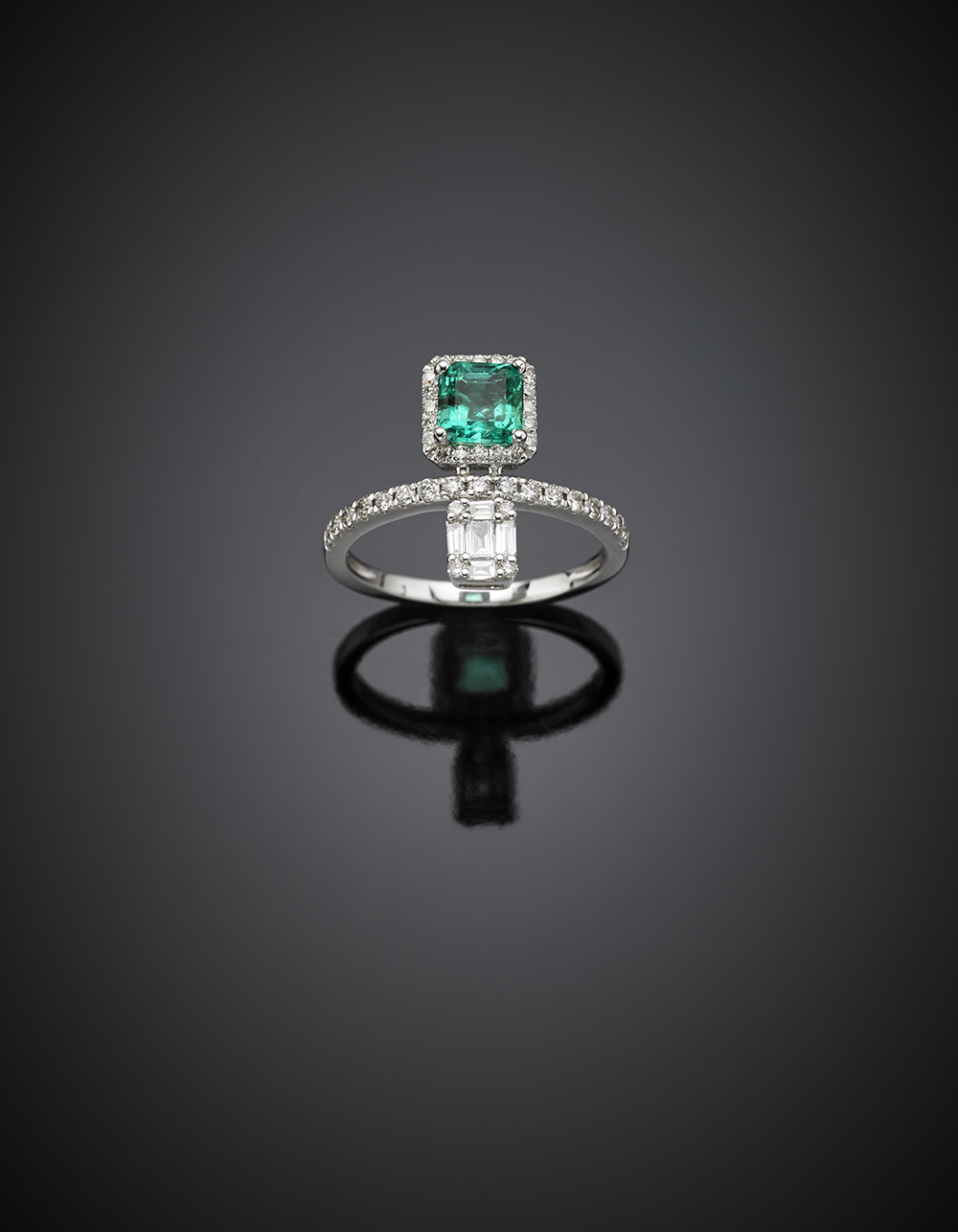 Carré emerald with round and baguette cut diamonds white gold ring, g 3.08 size 13/53.