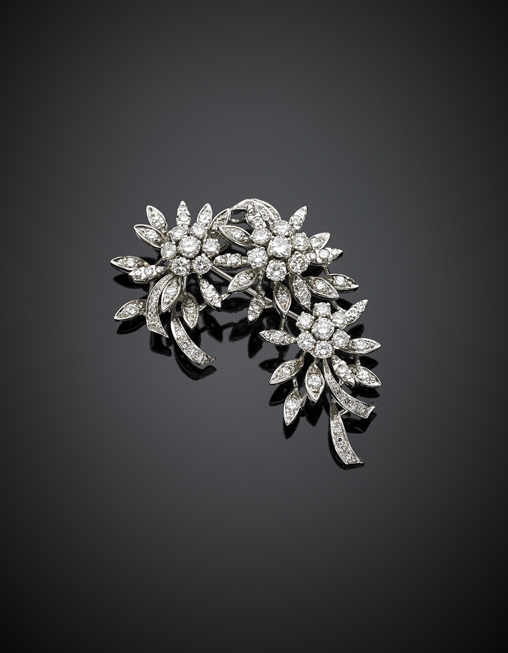 Spilla floreale in oro bianco con diamanti rotondi taglio a brillante moderno europeo per complessivi ct. 4 circa, g 16, lungh. cm 6, largh. cm 3 circa. Marcata 484 AL. In scatola Nardi Venezia