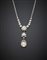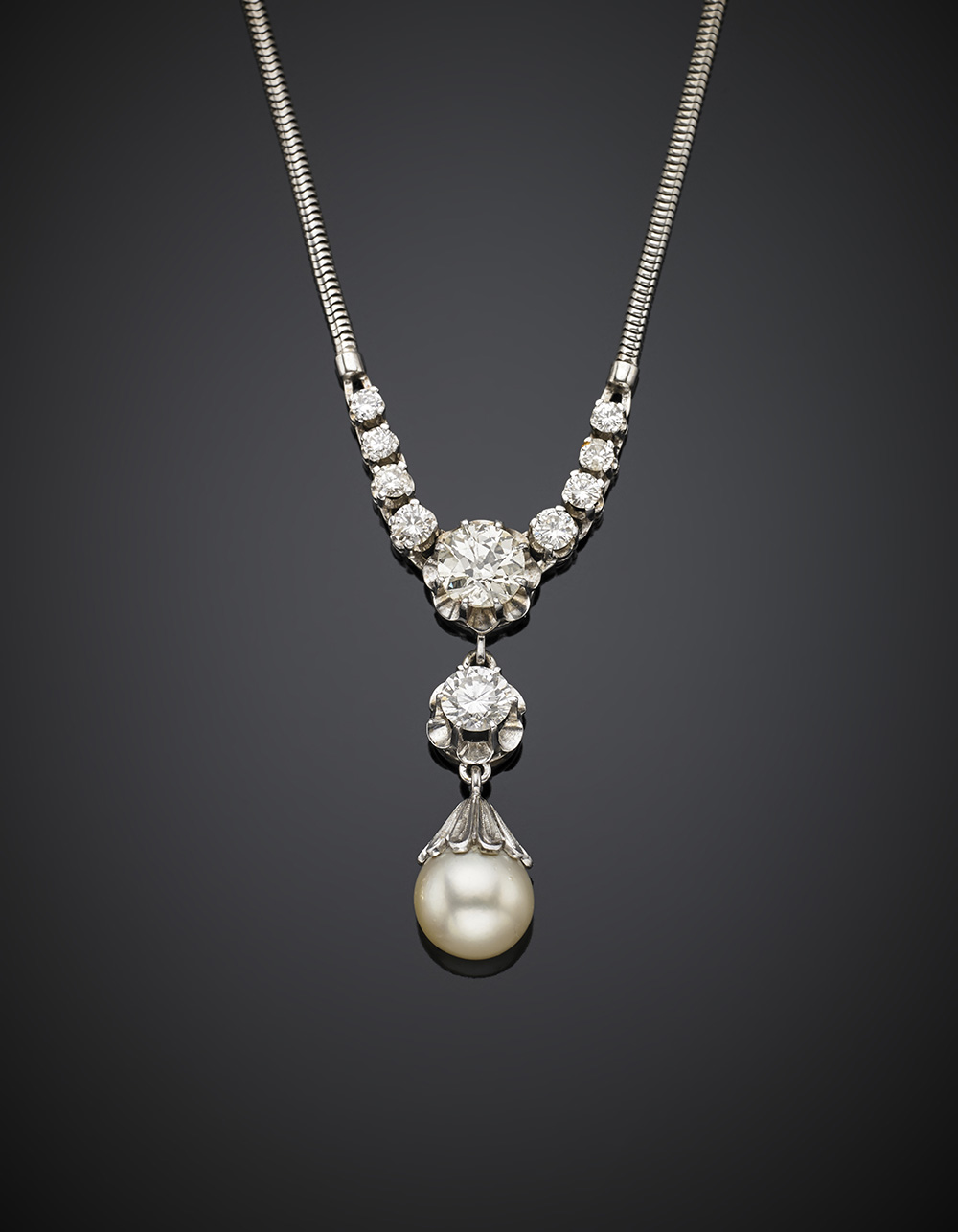 Catenina a coda di topo in oro bianco con centrale pendente in diamanti rotondi di ct. 1,17 circa e di ct. 0,60 circa, una perla e diamanti più piccoli a rifinirlo, per complessivi ct. 2,40 circa g 14,53, lungh. cm 42 circa. Marcato 14 AR.