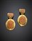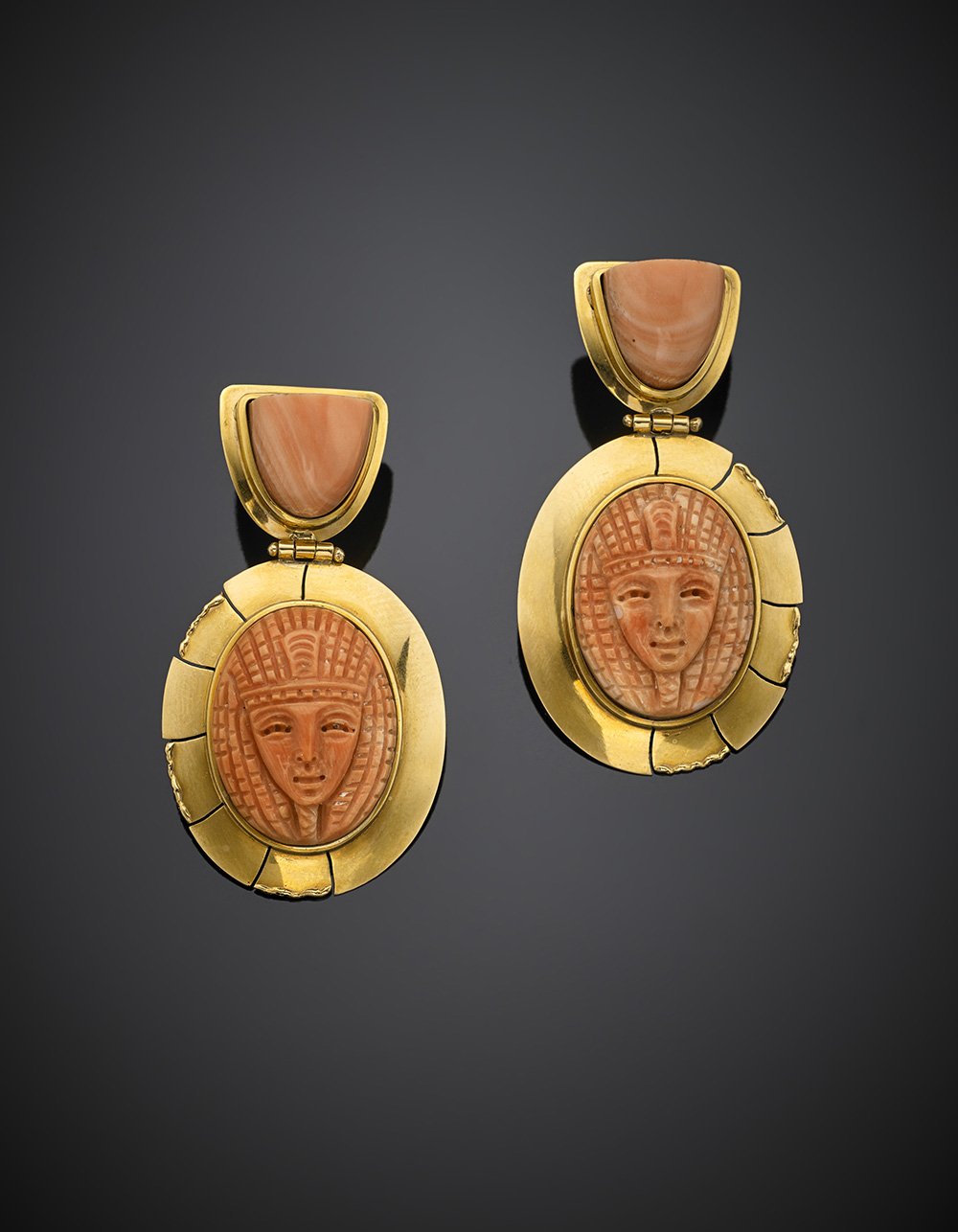 Orecchini pendenti in oro giallo con corallo rosa aranciato, gli ovali scolpiti a guisa di sfingi, g 21,76, lungh. cm 5, largh. cm 2,5 circa.