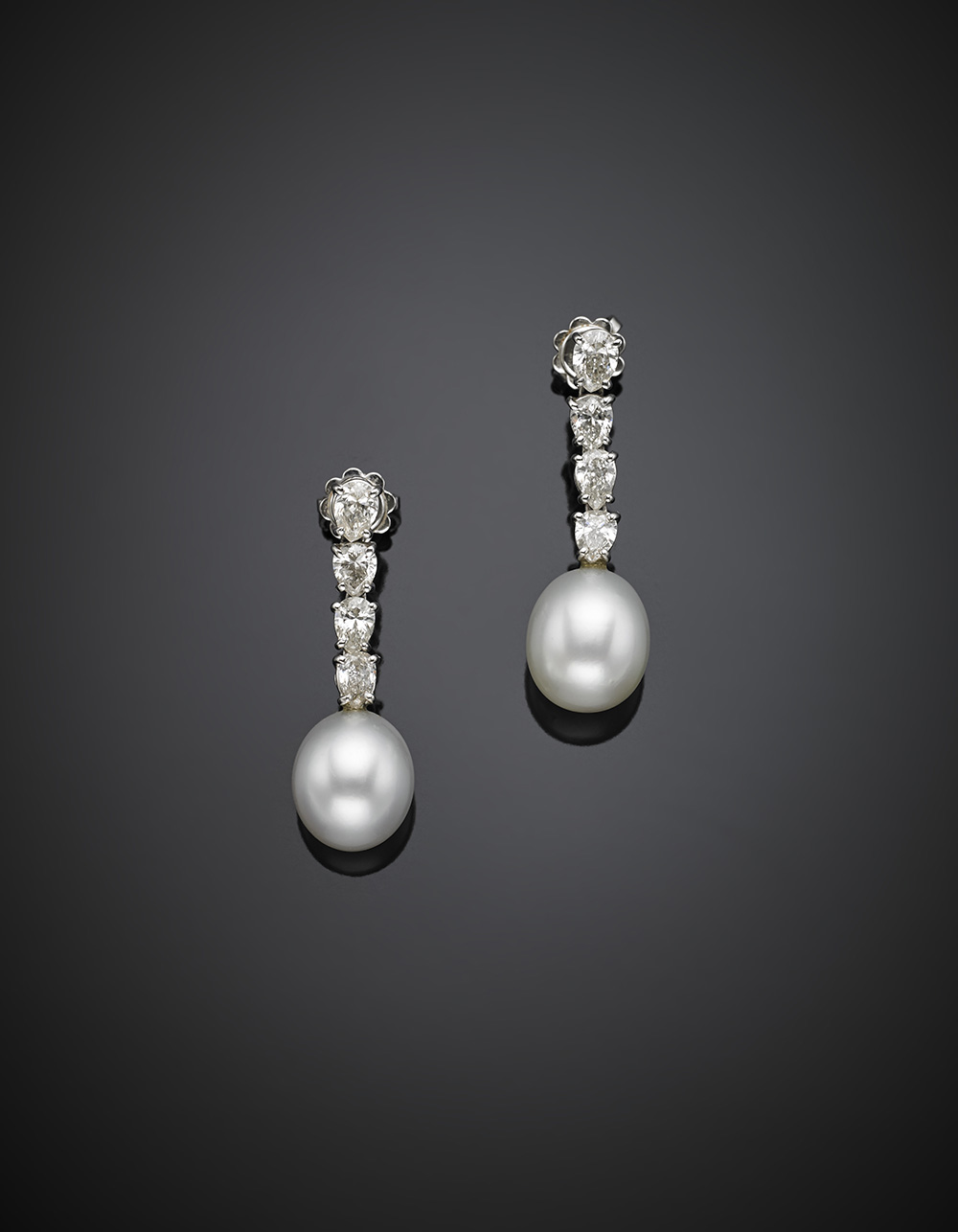 Orecchini pendenti in oro bianco e diamanti a goccia terminati da due perle australiane, per complessivi ct. 1,60 circa, g 8,87, lungh. cm 3,5 circa.