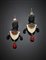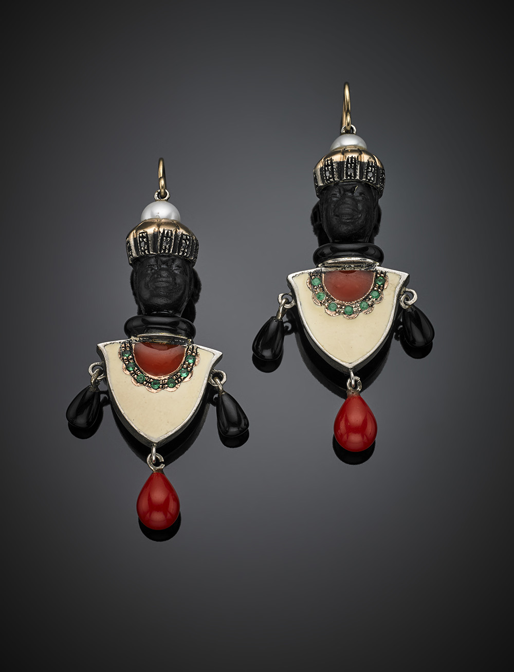 Red 9K gold, black wood, half pearl and enamel blackamoor pendant earrings, green gem accenting, g 22.87, length cm 7 circa.