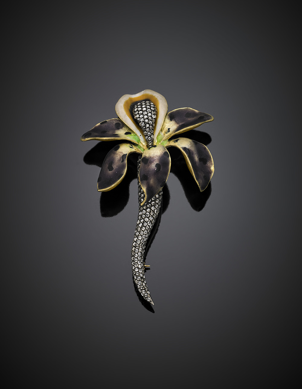 Spilla in oro giallo, argento, smalti policromi e diamanti per complessivi ct. 0,50 circa a guisa di orchidea, g 26,14, lungh. cm 7,5, largh. cm 4,5 circa. Marchi francesi di importazione.