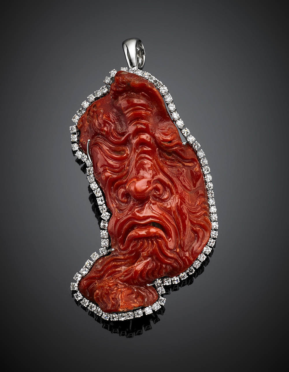 Pendente in corallo rosso scolpito a guisa di divinità, oro bianco e diamanti per complessivi ct. 4 circa, g 50,59, lungh. cm 9, largh. cm 4 circa.