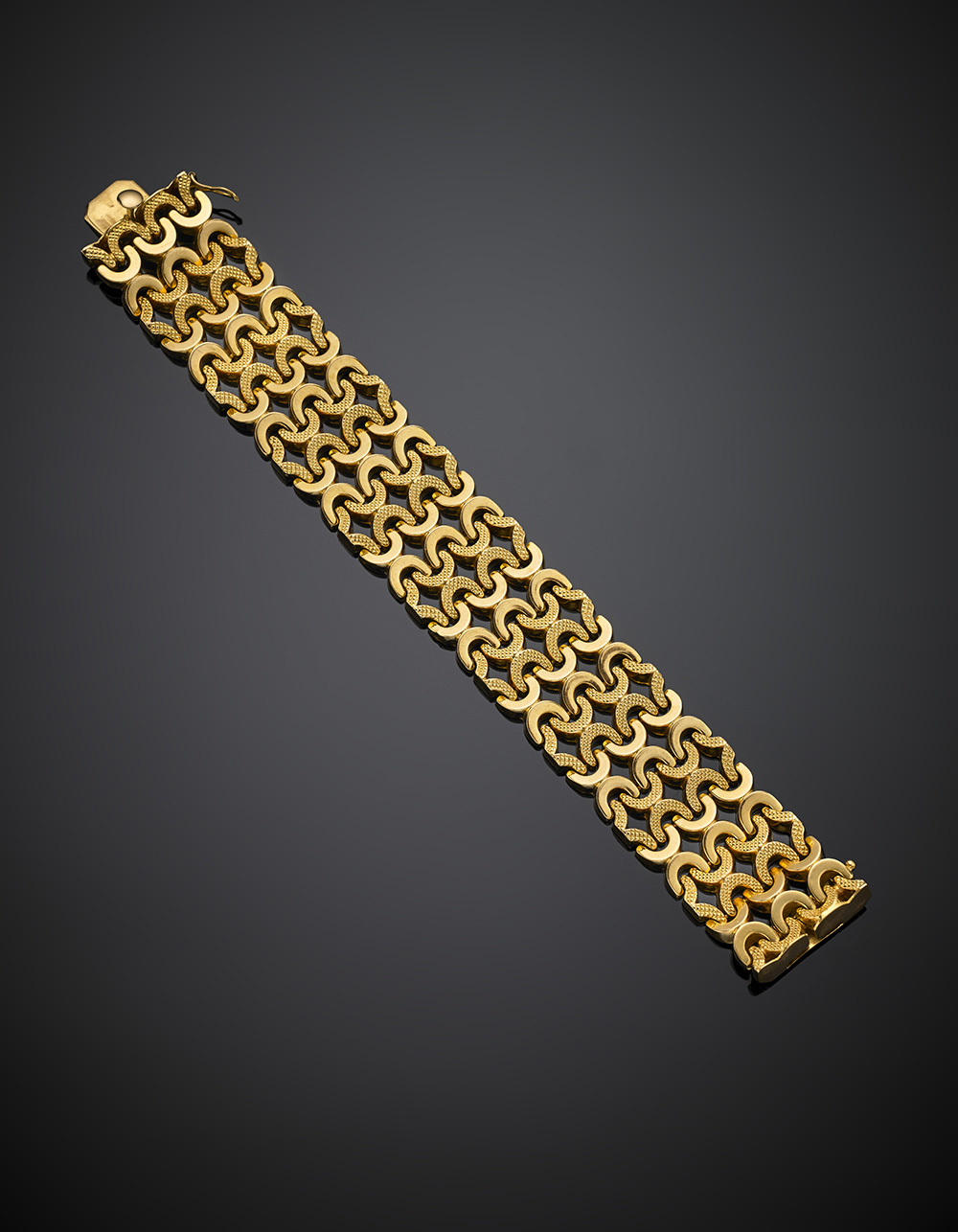 Bracciale modulare in oro giallo con maglie lucide e satinate, g 54,13, lungh. cm 19, h cm 2,50 circa. Marcato FOB, 3 VI.