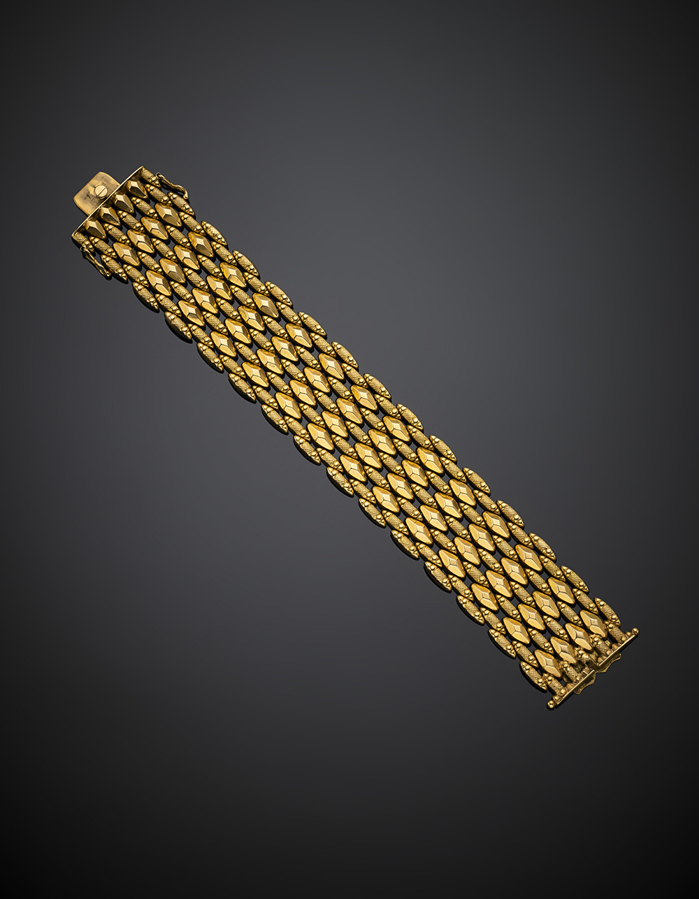 Bracciale modulare in oro giallo lucido e zigrinato, g 57,21, lungh. cm 18,70, h cm 2,80 circa. Marcato 173 AL.