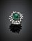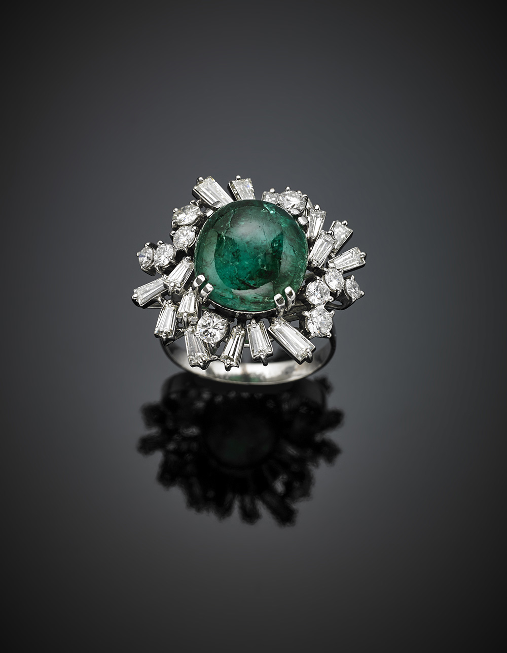 Anello in oro bianco con diamanti tapered e rotondi per complessivi ct. 4 circa a contornare uno smeraldo ovale cabochon di ct. 8,12 circa, g 9,72 misura 23/63.