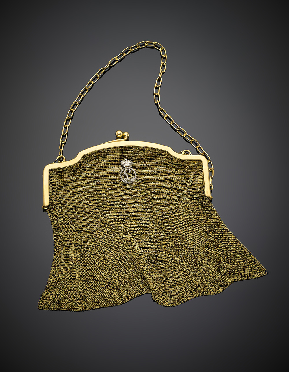 Yellow gold net purse with platinum crowned monogram, g 239.79, length cm 14, width cm 15 circa.