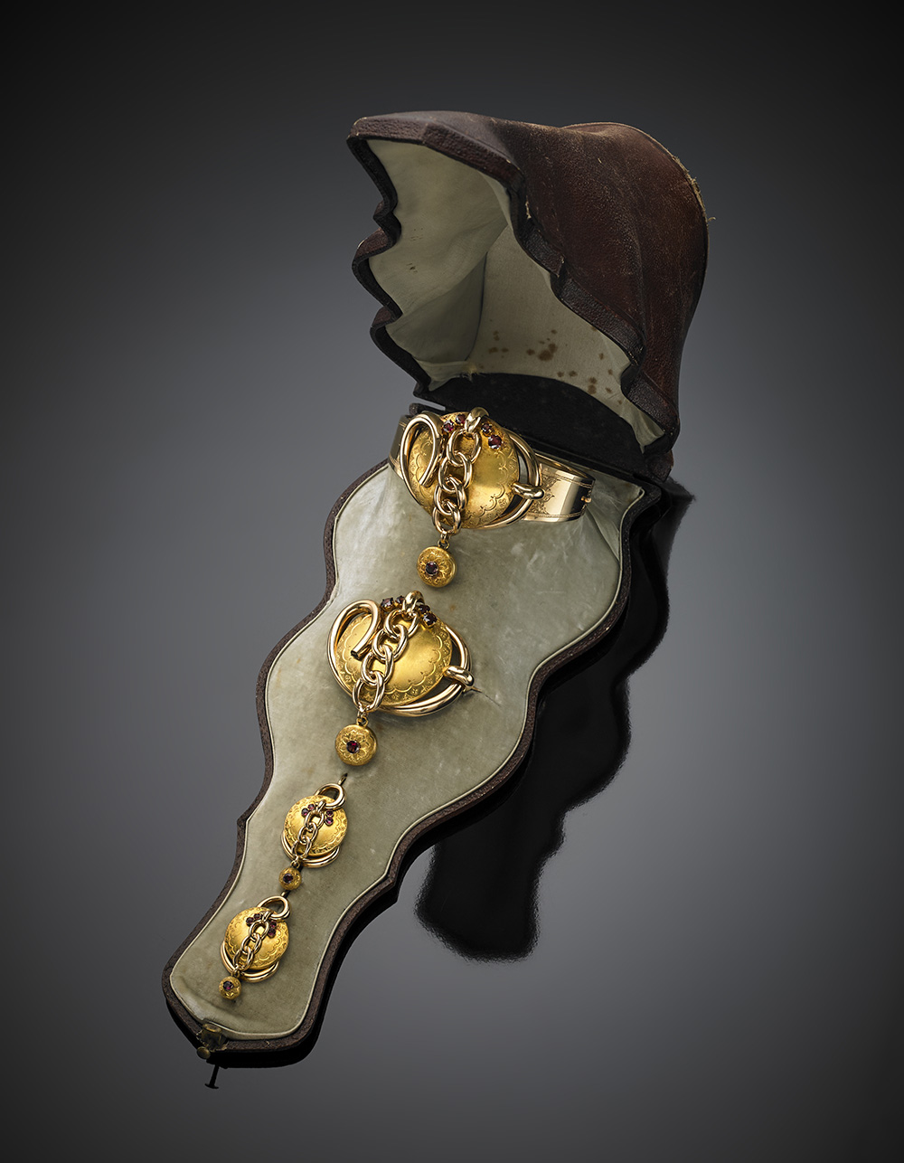 Yellow 9K partly chiselled gold jewelry set comprising cuff bracelet. brooch and pendant earrings all accented with garnets. "Regno di Napoli e delle due Sicilie" marks. In original antique case
