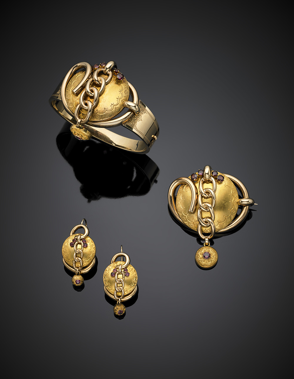 Demi parure in oro giallo 333/1000 in parte cesellato composta da bracciale rigido, spilla e orecchini pendenti, rifinita in granati. Marchi italiani del Regno di Napoli e delle due Sicilie. In scatola originale antica