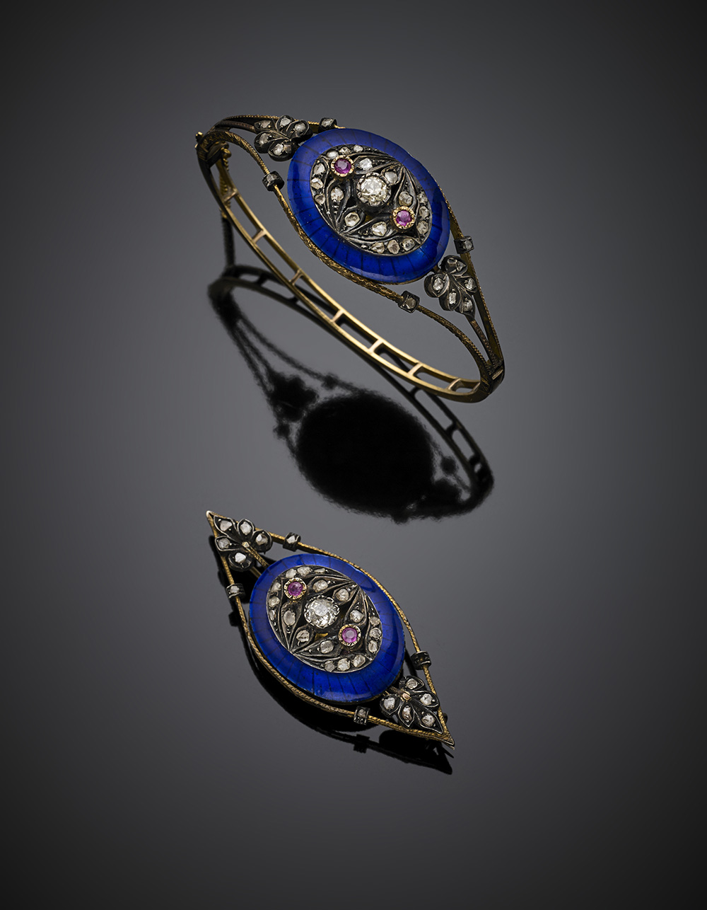 Demi-parure in oro giallo in parte cesellato e argento, composta da spilla 6 x 2.4 cm e bracciale rigido diametro 6.5 cm rifiniti con smalti blu, diamanti rotondi e a mezza rosetta per complessivi ct. 0,90 circa, complessivi g 37,09. (difetti)