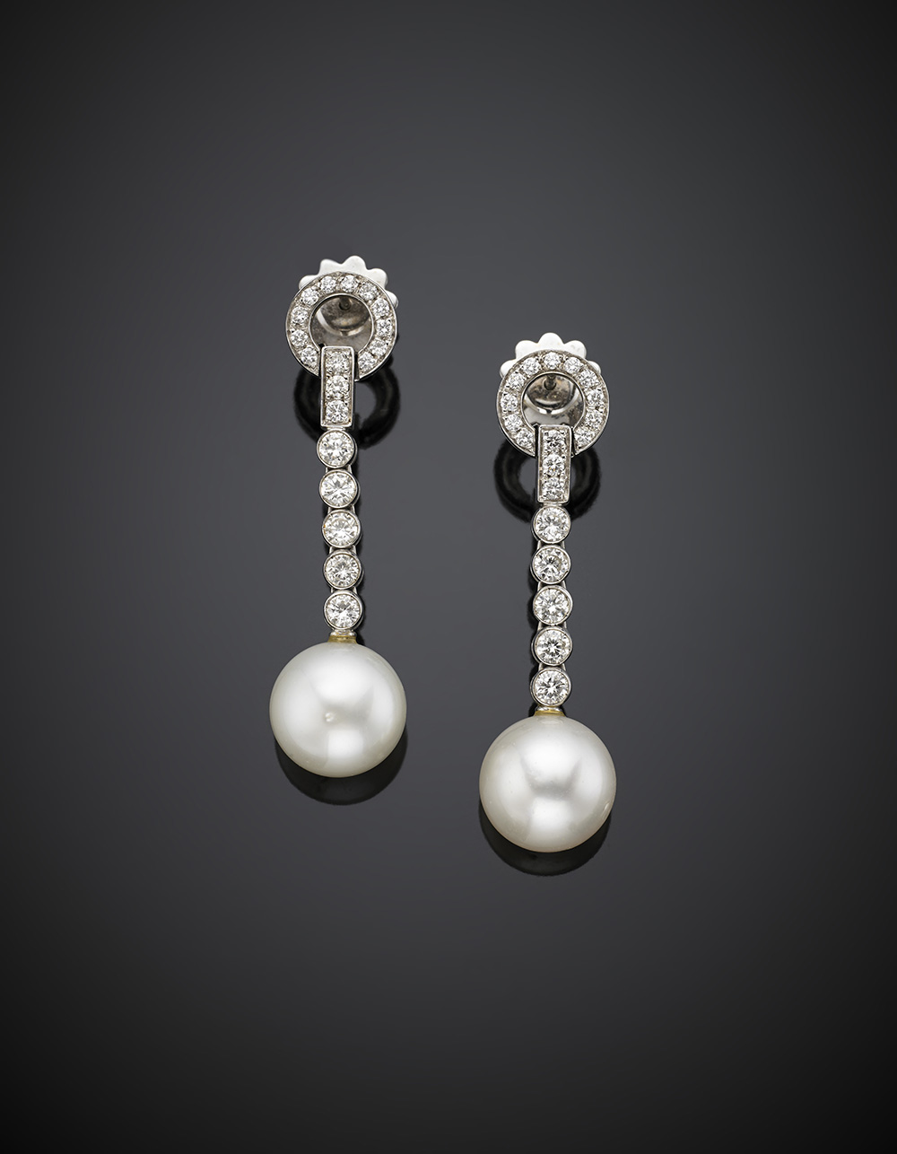 White gold diamond pendant earrings suspending two mm 12.55 round pearls, g 12.82, length cm 4.60 circa.