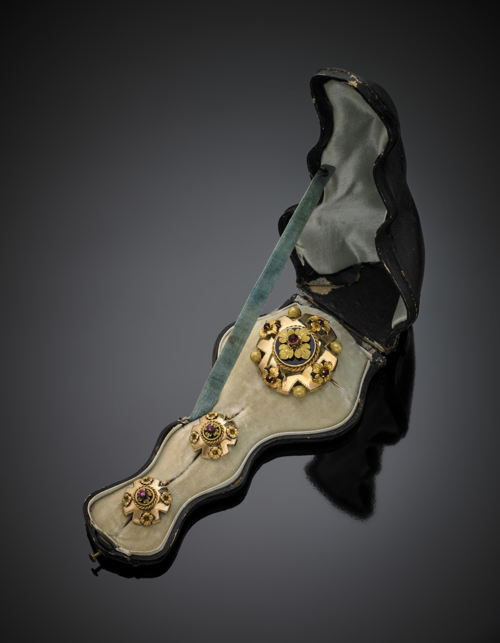 Demi parure in oro giallo rosa in parte cesellato composta da spilla e orecchini pendenti, rifinita con smalto nero, granati e paste vitree, complessivi g 19,92. Marchi del Regno di Napoli e delle due Sicilie. In scatola originale antica