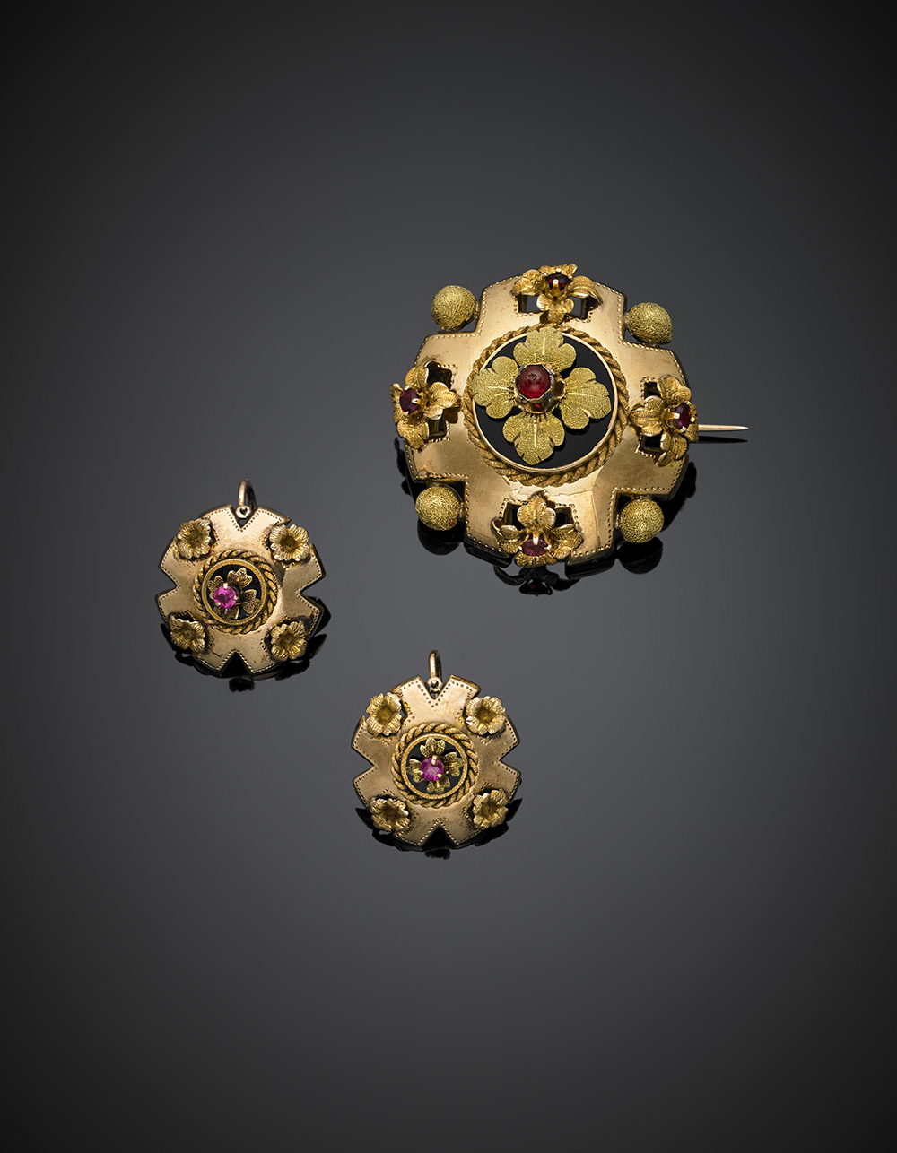 Pink and yellow partly chiselled gold jewelry set comprising brooch and earrings accented with black enamel, garnets and pastes, in all g 19.92. "Regno di Napoli e delle due Sicilie" marks. In original antique case