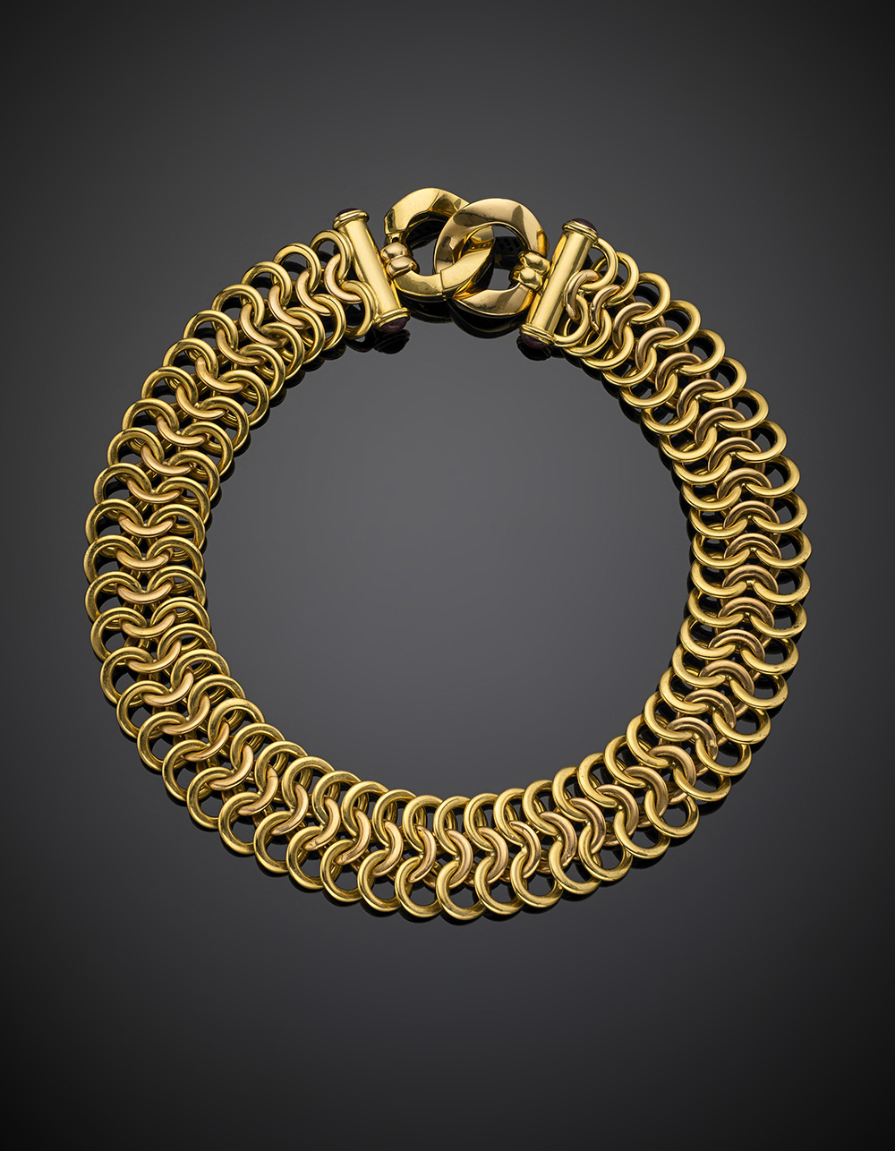 Collier in oro giallo e rosa a maglia inanellata, chiusura rifinita con rubini cabochon, g 152,06, lungh. cm 48, largh. cm 2,70 circa. Firmato e marcato Effedue, 1496 VI.