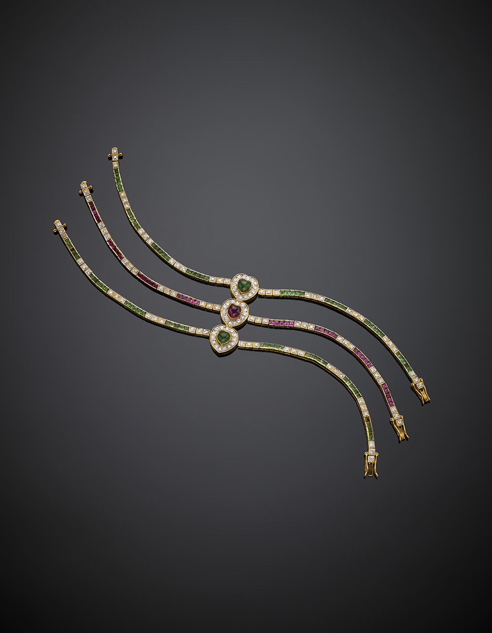 Bracciale a tre file in oro giallo con diamanti rotondi , smeraldi e rubini carrè alternate e rifinite in centro con tre cuori cabochon in smeraldi e rubino, diamanti per complessivi ct. 3,50 circa rubini per complessivi ct. 0,90 circa e smeraldi per complessivi ct. 1.2 circa g 25,5, lungh. cm 15,5 circa.