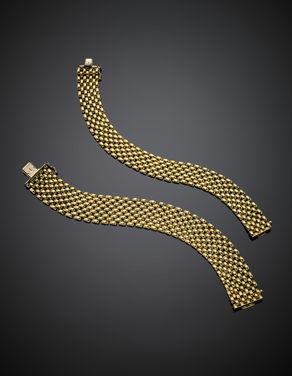 Lotto di due bracciali in oro giallo a maglia modulare, complessivi g 46,6, lungh. cm 19 circa. Marcati uno 465 AR e l'altro 707 AR.