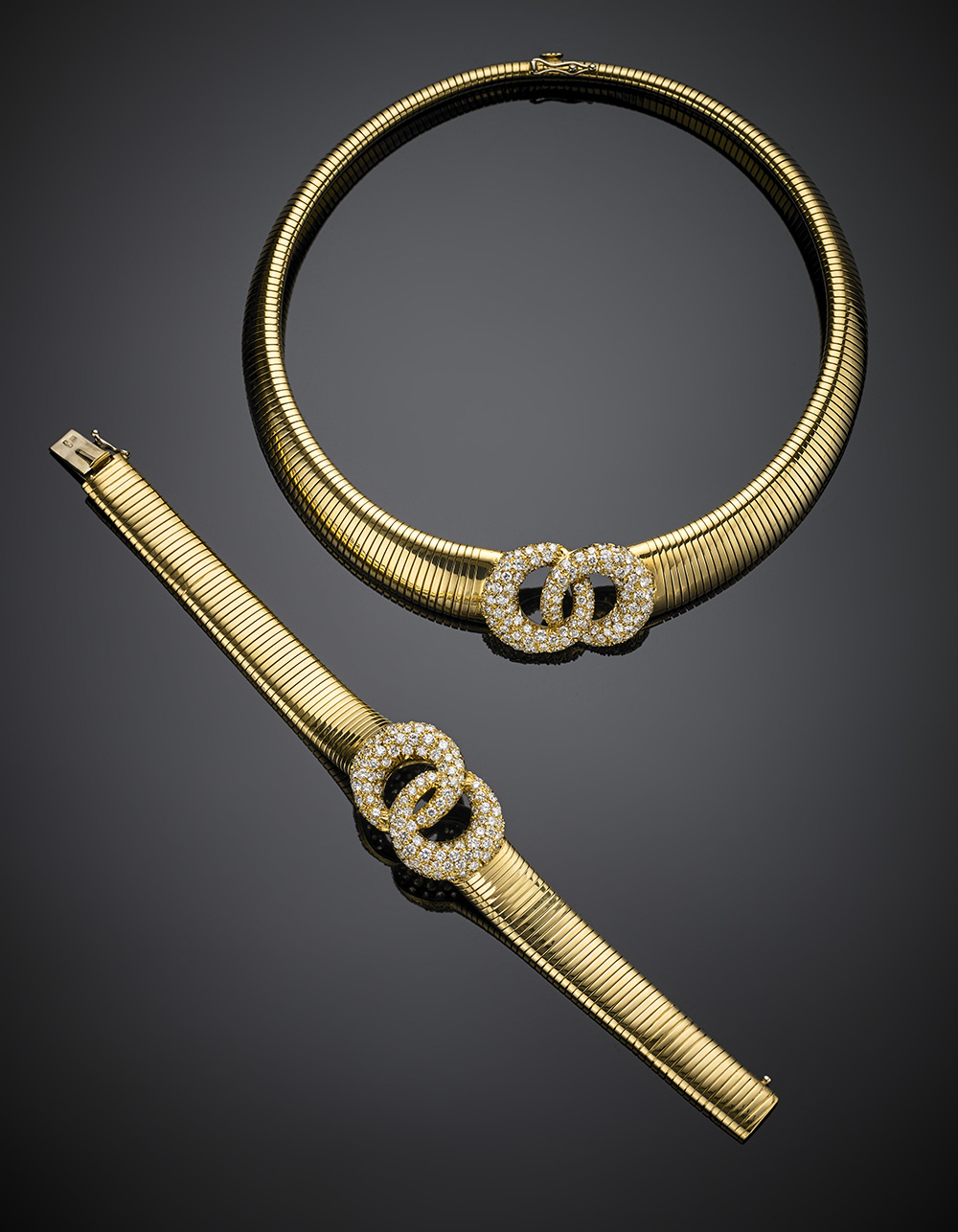 Yellow gold tobo-gaz jewelry set comprising necklace and bracelet with diamond pavé central motiv, in all ct. 5 circa, necklace cm 36 bracelet cm 18.5, in all g 152.73. Marked in square outline OE.