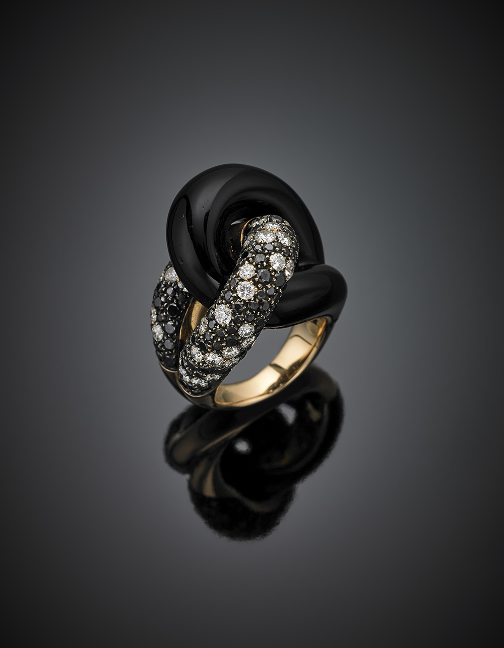 Anello a nodo in oro giallo e onice con diamanti bianchi per complessivi ct. 2 circa e neri per complessivi ct. 3 circa, g 20,86 misura 14/54. Marcato 3130 AL.