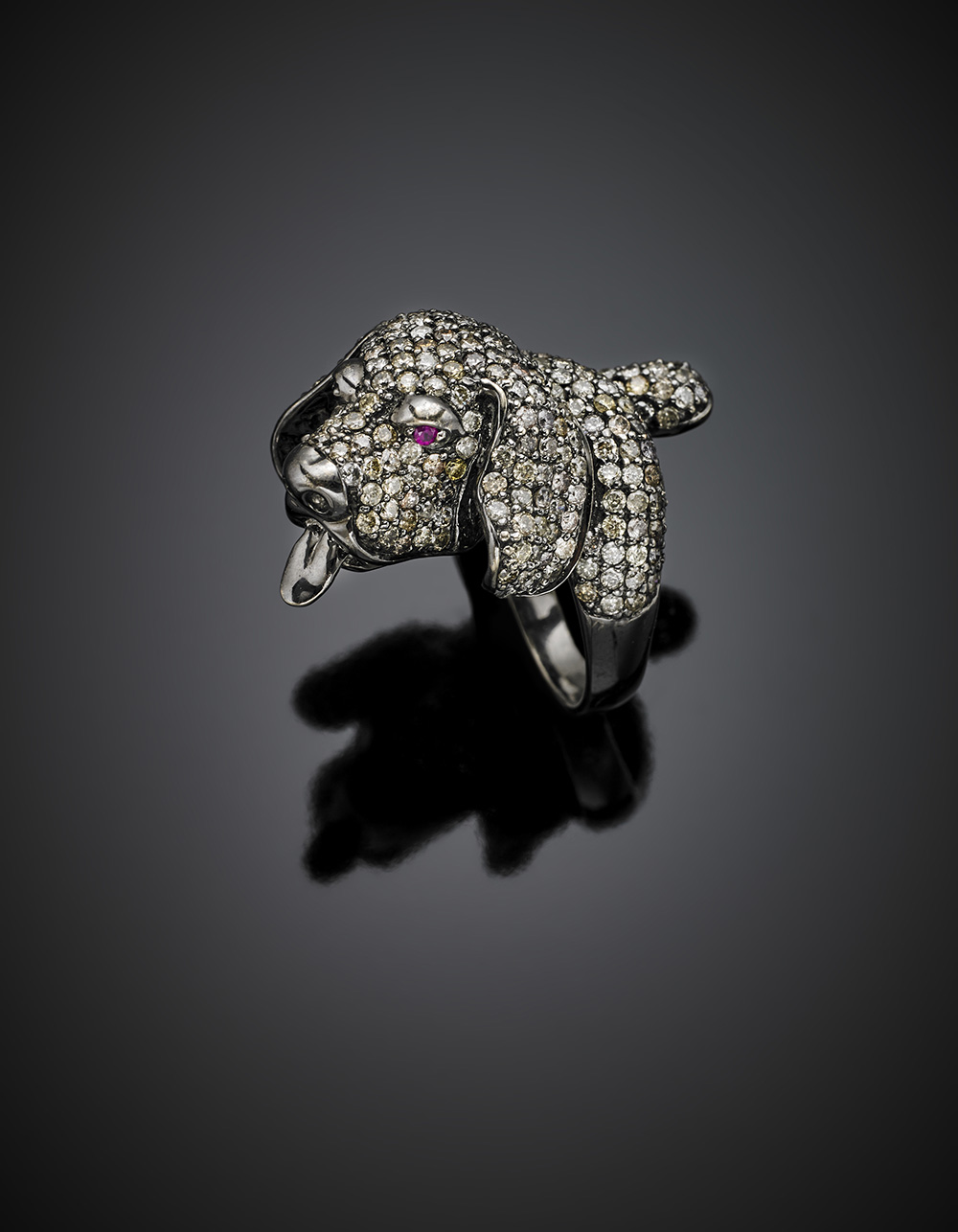 Anello in oro rodiato nero a guisa di testa di cane con diamanti brown a pavé per complessivi ct. 3 circa e rubini per gli occhi, g 17,48 misura 13/53.