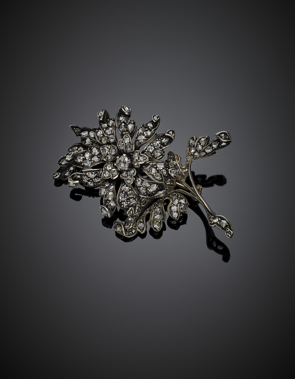 Silver and gold rose cut diamond mobile flower brooch, g 17.33, length cm 7, width cm 5 circa.