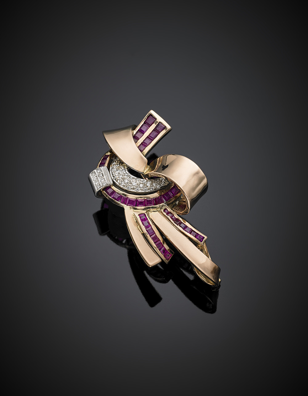 Spilla in oro rosso e bianco, diamanti per complessivi ct. 0,20 circa e rubini per complessivi ct. 3,5 circa g 13,81, lungh. cm 5,50, largh. cm 3,60 circa.