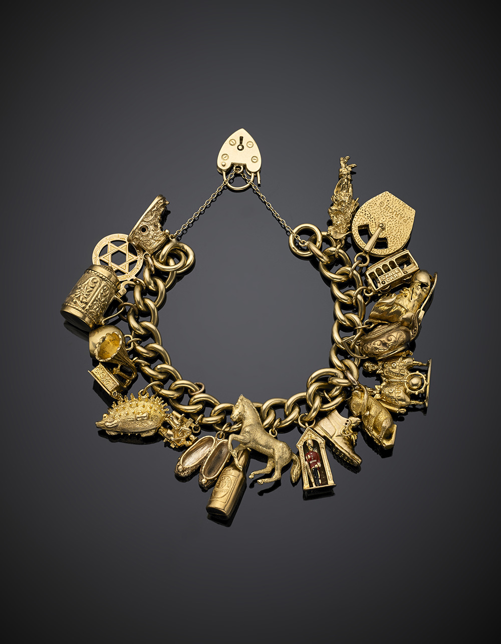 Bracciale a catena in oro giallo con molti charms, tutto in oro 333/1000, g 133,83, lungh. cm 19 circa.