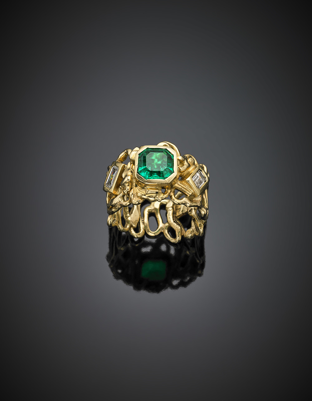 Octagonal ct. 1.80 circa emerald and diamond yellow wrought gold ring, diamonds in all ct. 0.50 circa, g 11.67 size 16/56.
