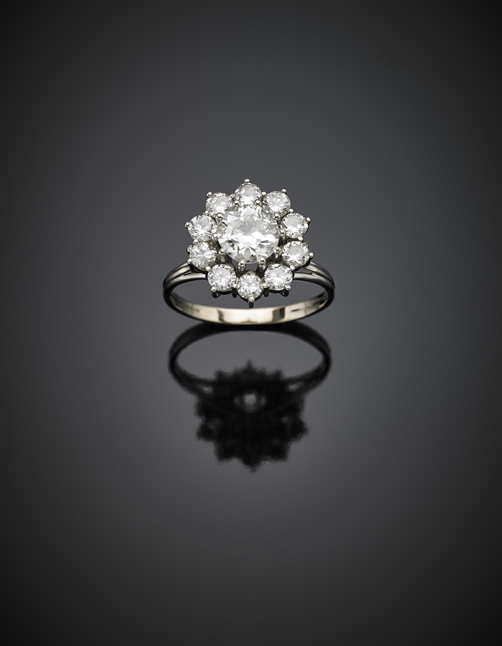 Anello in oro bianco e diamanti, il centrale di ct. 1,53 circa contornato da diamanti più piccoli, per complessivi ct. 2,80 circa g 5,16 misura 21,5/61,5.