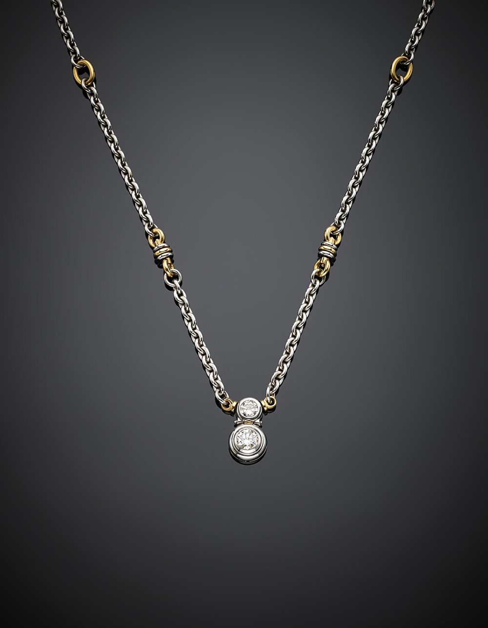Catena in oro bianco e giallo con centrale snodato rifinito con due diamanti di ct. 1,20 circa e di ct. 0,80 circa, g 54, lungh. cm 66,50 circa.