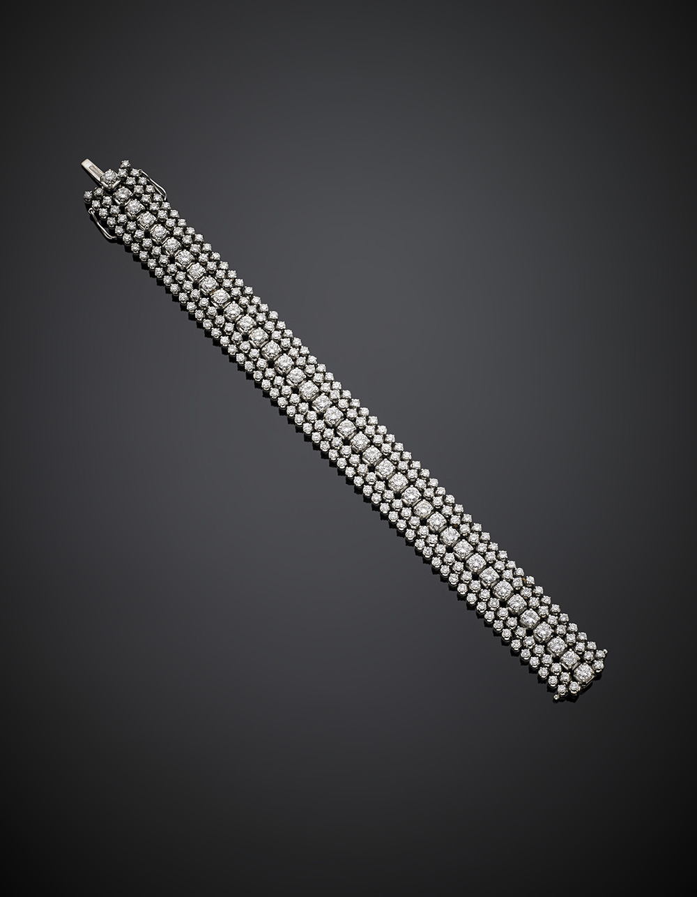 Bracciale in oro bianco con diamanti per complessivi ct. 14 circa g 69,77, lungh. cm 13,30, largh. cm 1,50 circa. Marcato 757 AL.