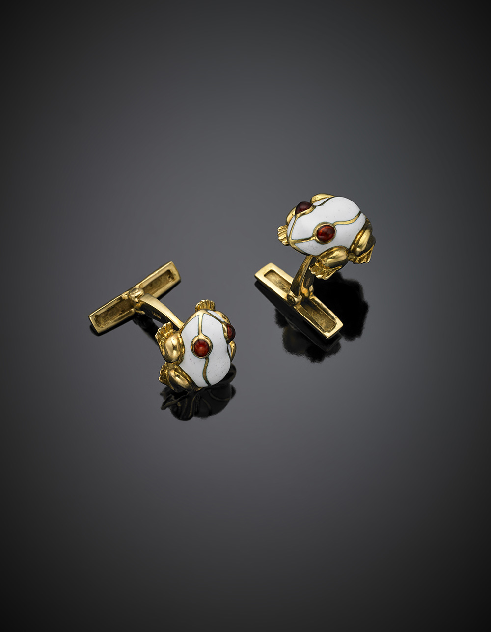 Gemelli a guisa di rane in oro giallo e smalto bianco, smalto rosso per gli occhi, g 15,95, lungh. cm 1,7, largh. cm
