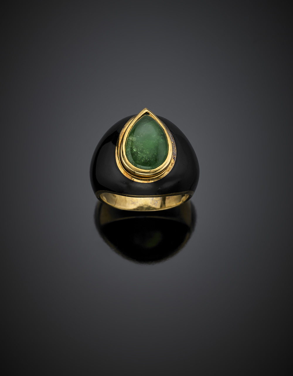 Anello in oro giallo, smeraldo a goccia cabochon di ct. 5,50 circa, rifinito in smalto nero, g 17,44 misura 14/54. Marcato 925 AL.