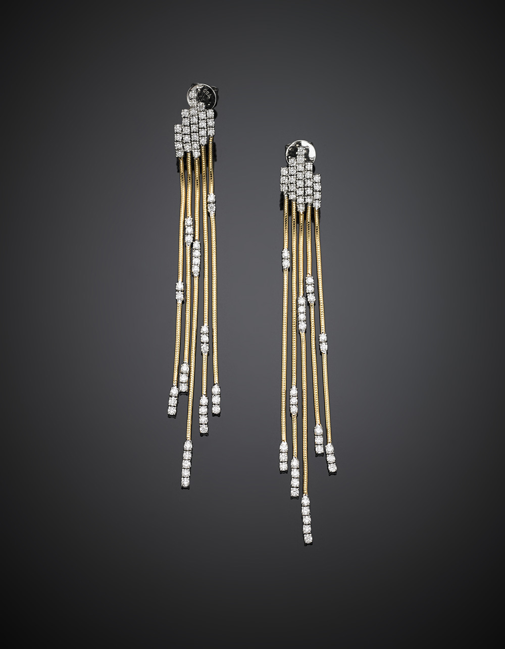 Orecchini pendenti a nappa in oro giallo e bianco con diamanti per complessivi ct. 2,50 circa, g 15,26, lungh. cm 9,5 circa.