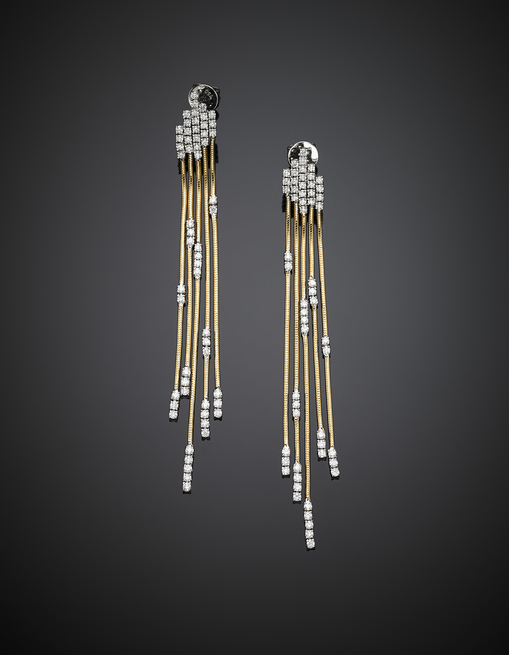 Bi-coloured gold diamond rat's tail tassel pendant earrings, in all ct. 2.50 circa, g 15.26, length cm 9.5 circa.